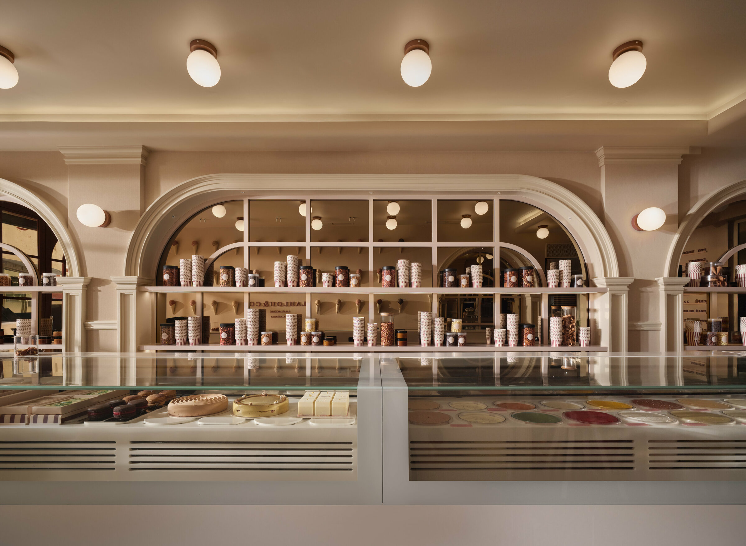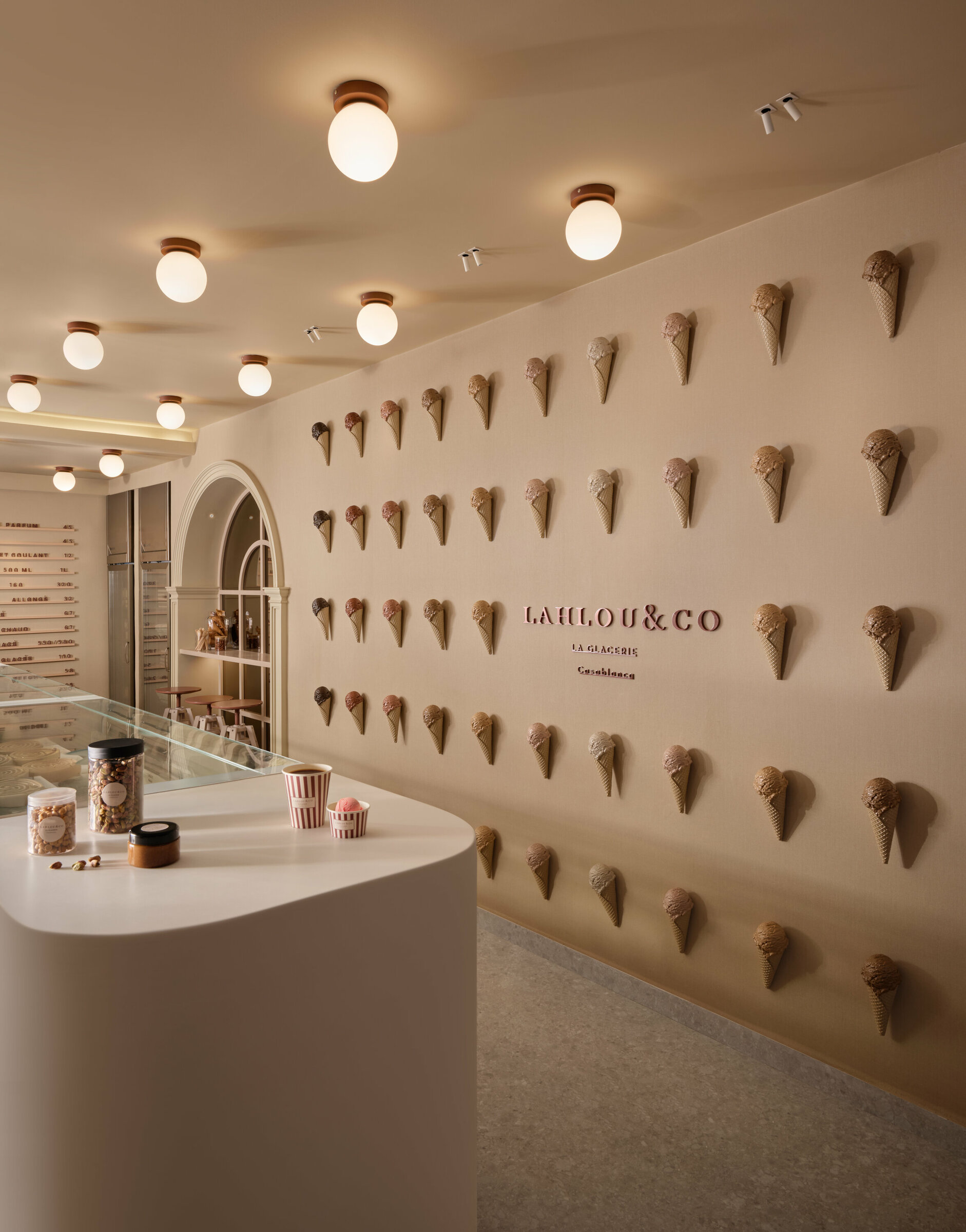 Sous ses arches ivoire et sa façade aux rayures bordeaux et crème, Lahlou & Co est une glacerie qui affirme une identité à la fois douce et graphique. La répétition des cornets devient motif, presque manifeste, transformant le produit en élément architectural. Les lignes sont franches, les volumes maîtrisés. Colonnes cannelées, vitrines épurées, proportions justes : l’espace se lit comme une composition rigoureuse où couleur et géométrie dialoguent avec subtilité. Plus qu’une boutique, Lahlou & Co est une mise en scène urbaine, un signal visuel fort où architecture et gourmandise se rencontrent dans un langage contemporain assumé.