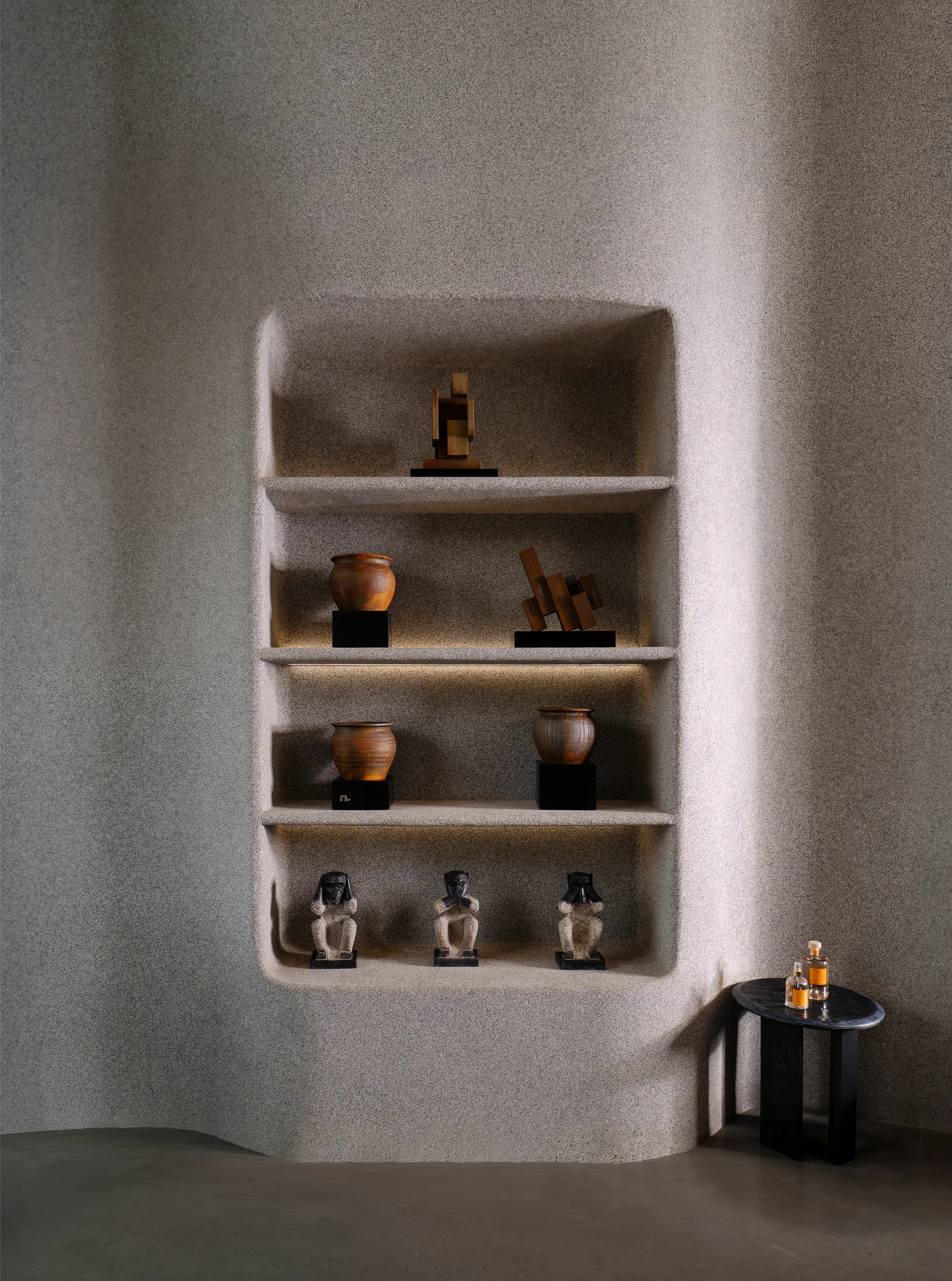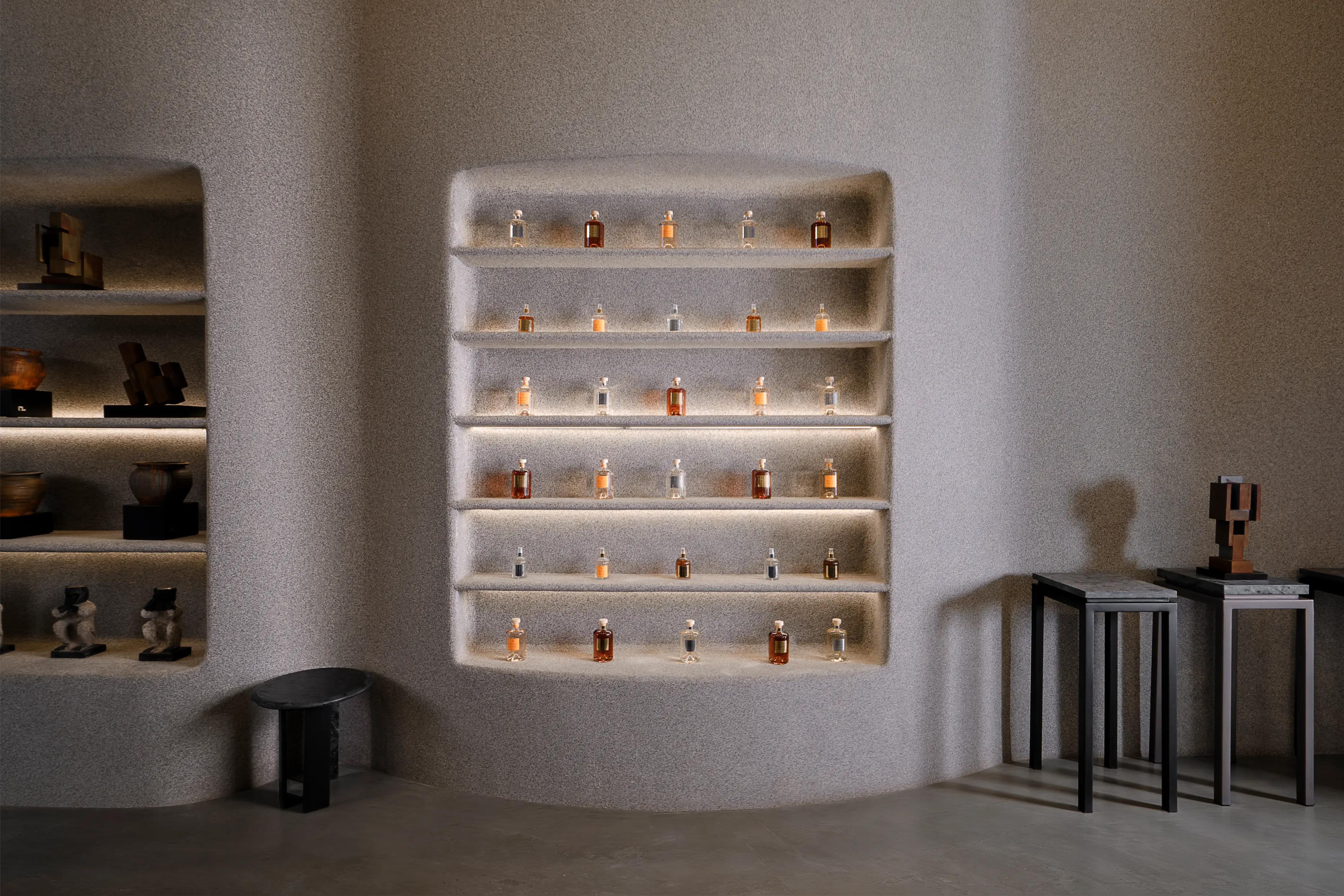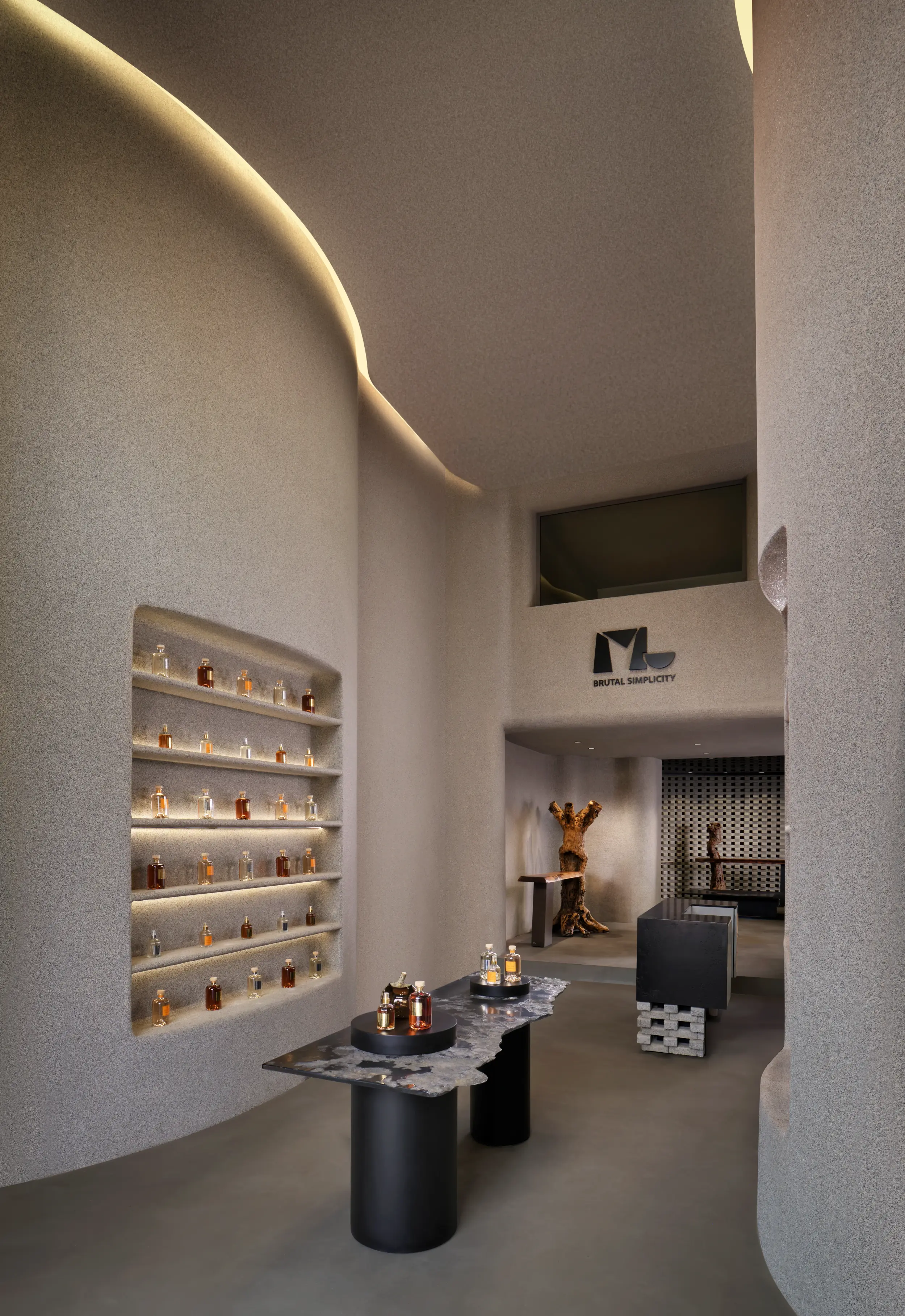 ML Atelier est une boutique dédiée à des pièces de mobilier singulières imaginées par un designer de renom. Conçu dans une approche minimaliste et brutaliste, l’espace met en tension matériaux bruts, lignes affirmées et volumes sculpturaux, tout en intégrant un mouvement organique qui adoucit et équilibre la composition architecturale. Pensé comme un lieu hybride, ML Atelier associe une sélection de senteurs et de bougies à une collection de meubles d’exception. Cette dualité entre rigueur minérale et fluidité organique crée un univers immersif où design, matière et sensorialité se rencontrent dans une esthétique contemporaine et maîtrisée.