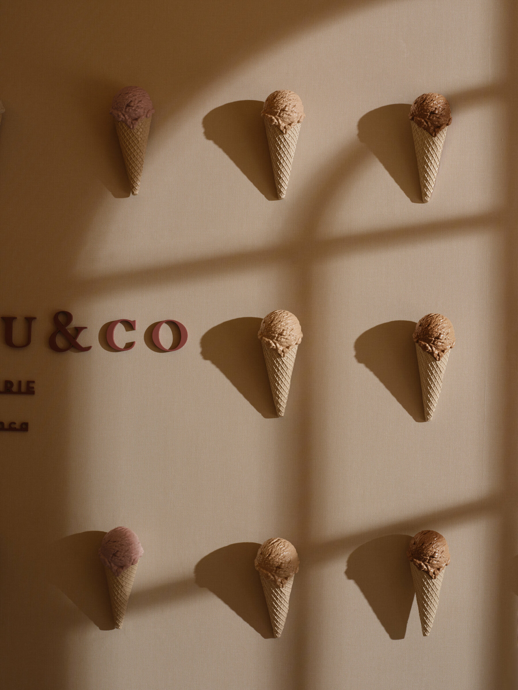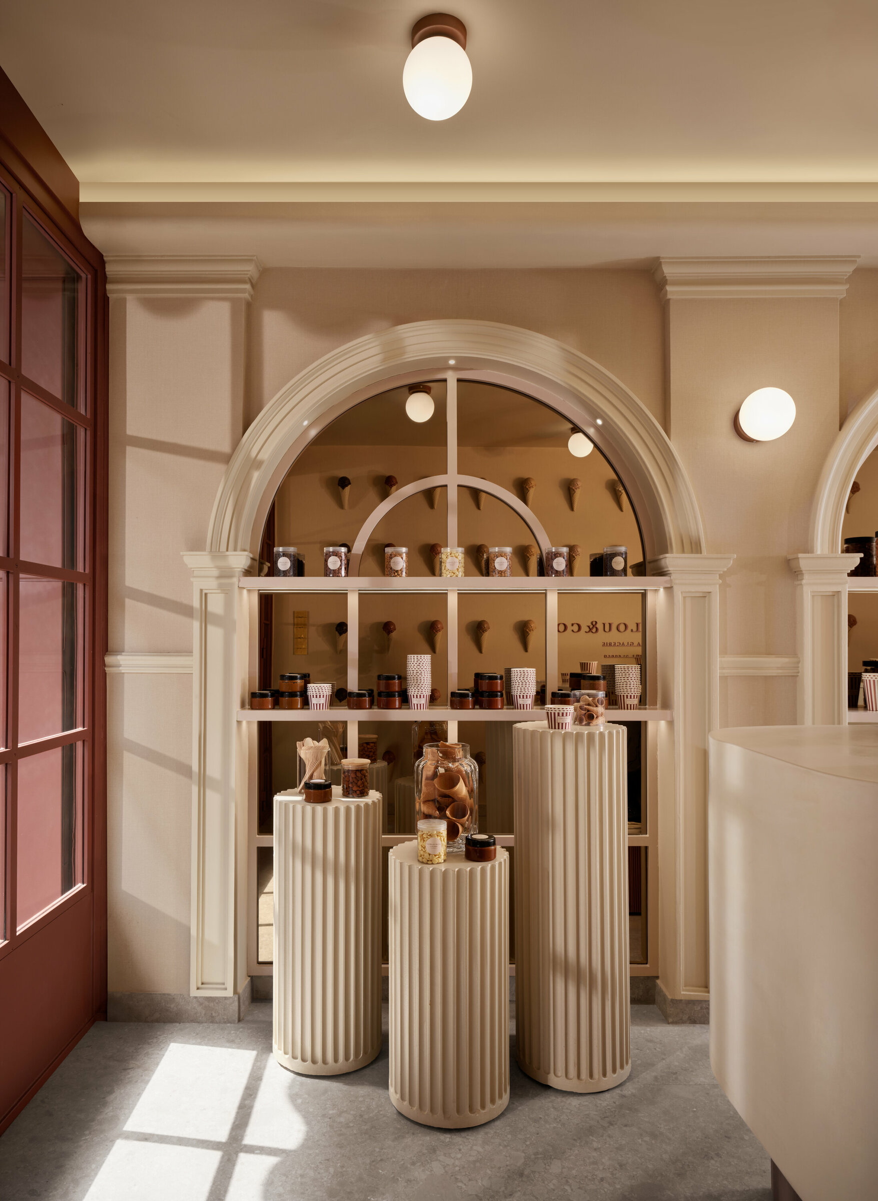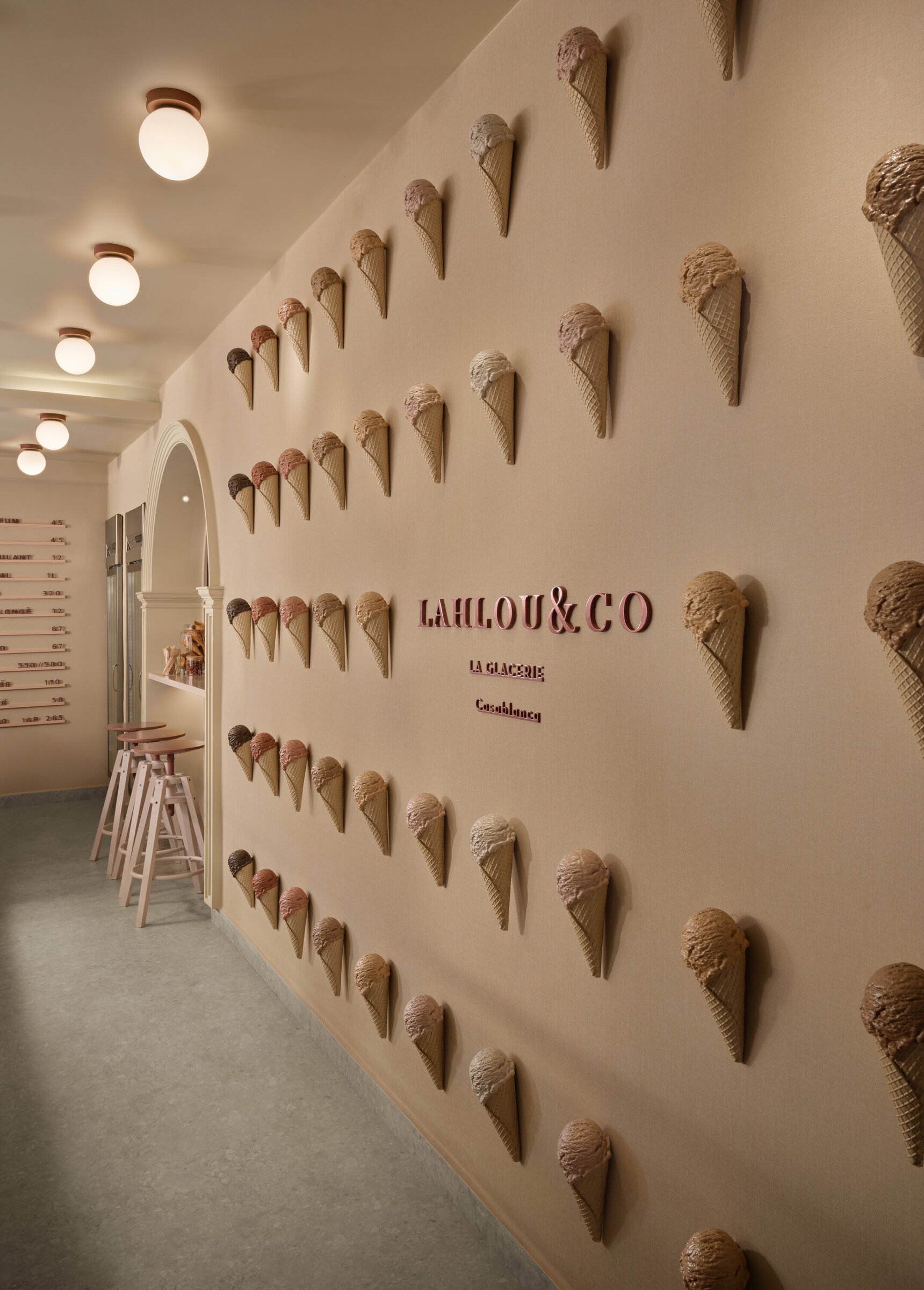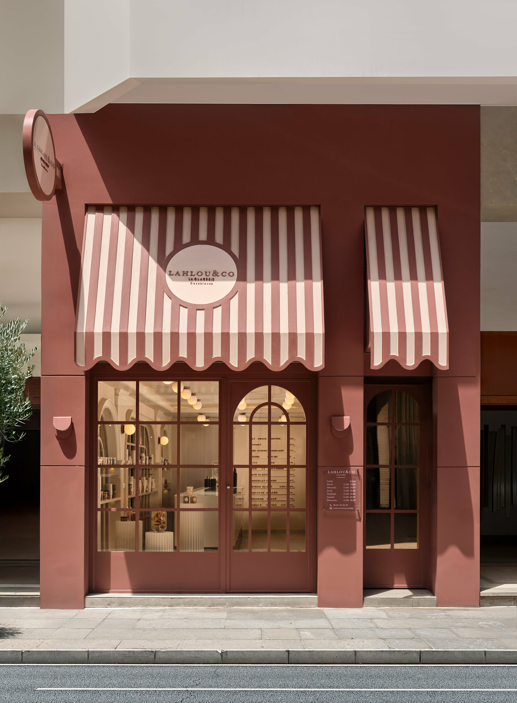 Sous ses arches ivoire et sa façade aux rayures bordeaux et crème, Lahlou & Co est une glacerie qui affirme une identité à la fois douce et graphique. La répétition des cornets devient motif, presque manifeste, transformant le produit en élément architectural. Les lignes sont franches, les volumes maîtrisés. Colonnes cannelées, vitrines épurées, proportions justes : l’espace se lit comme une composition rigoureuse où couleur et géométrie dialoguent avec subtilité. Plus qu’une boutique, Lahlou & Co est une mise en scène urbaine, un signal visuel fort où architecture et gourmandise se rencontrent dans un langage contemporain assumé.
