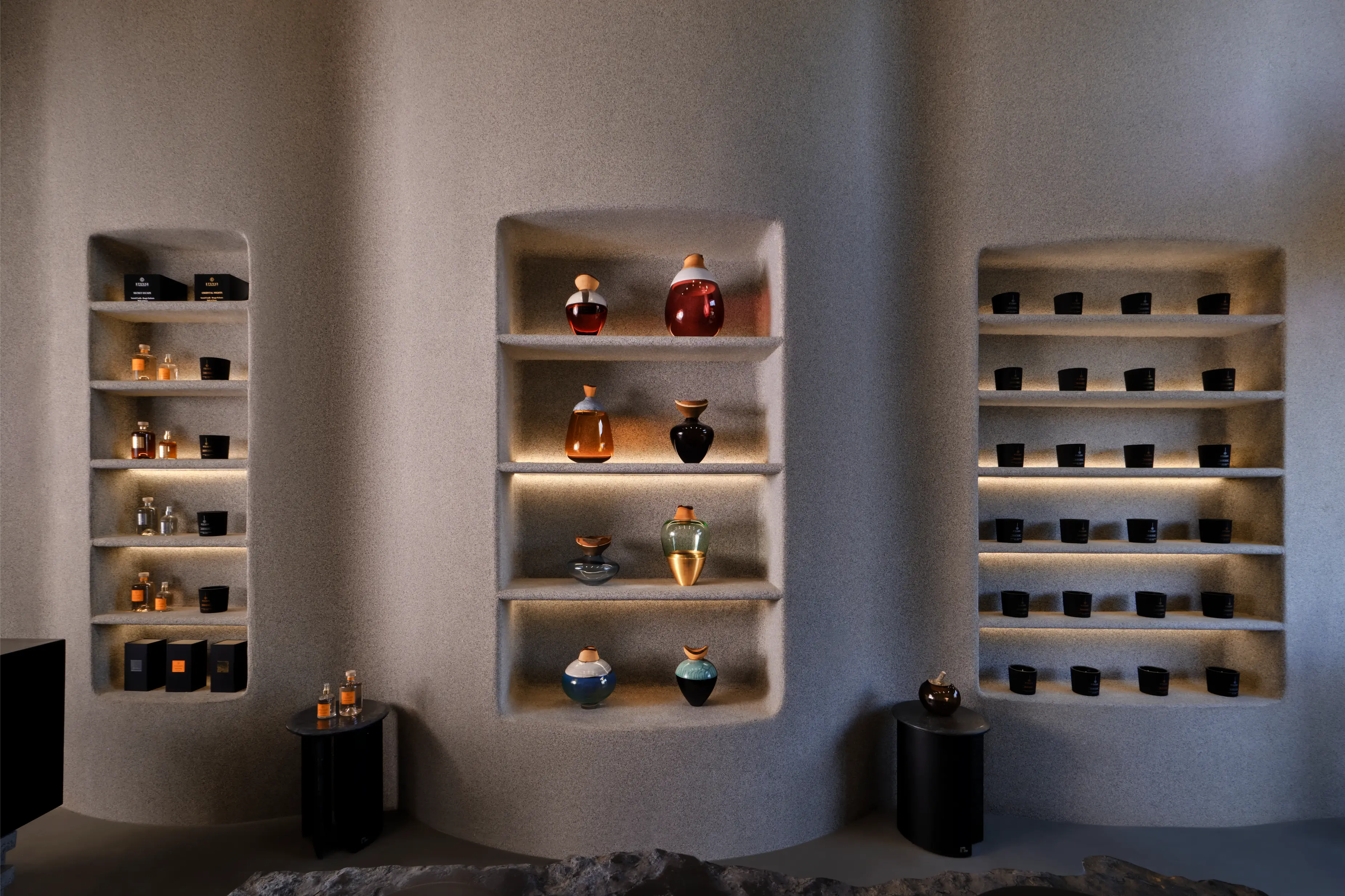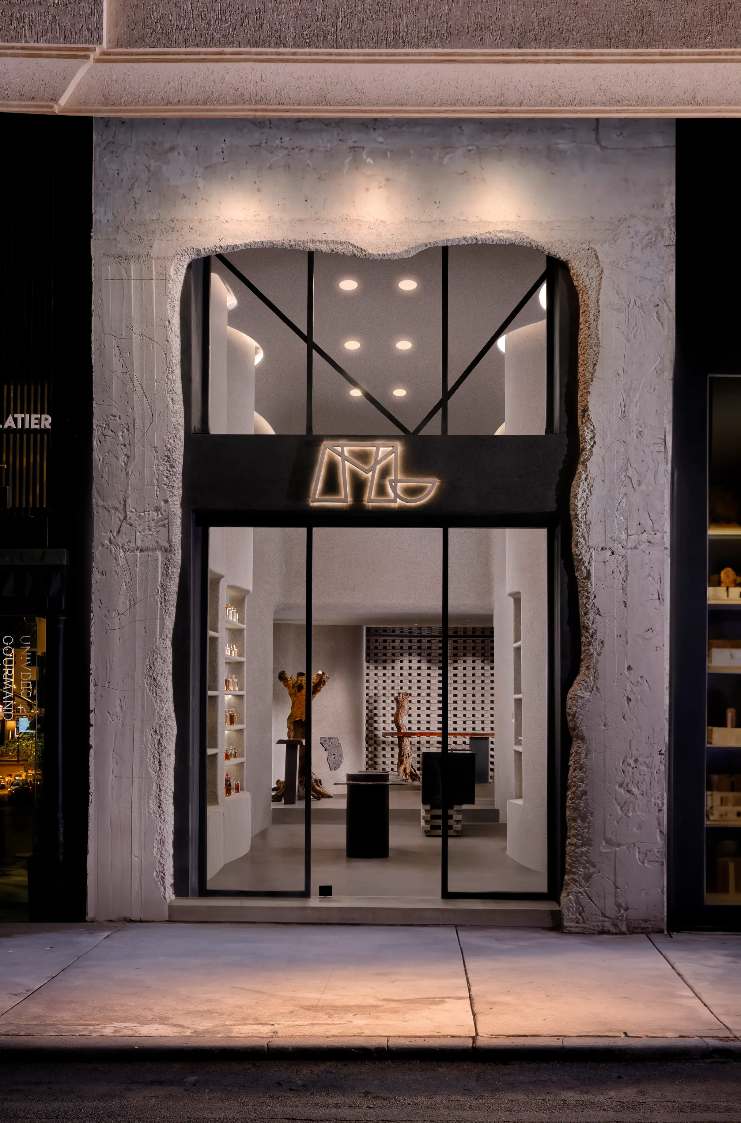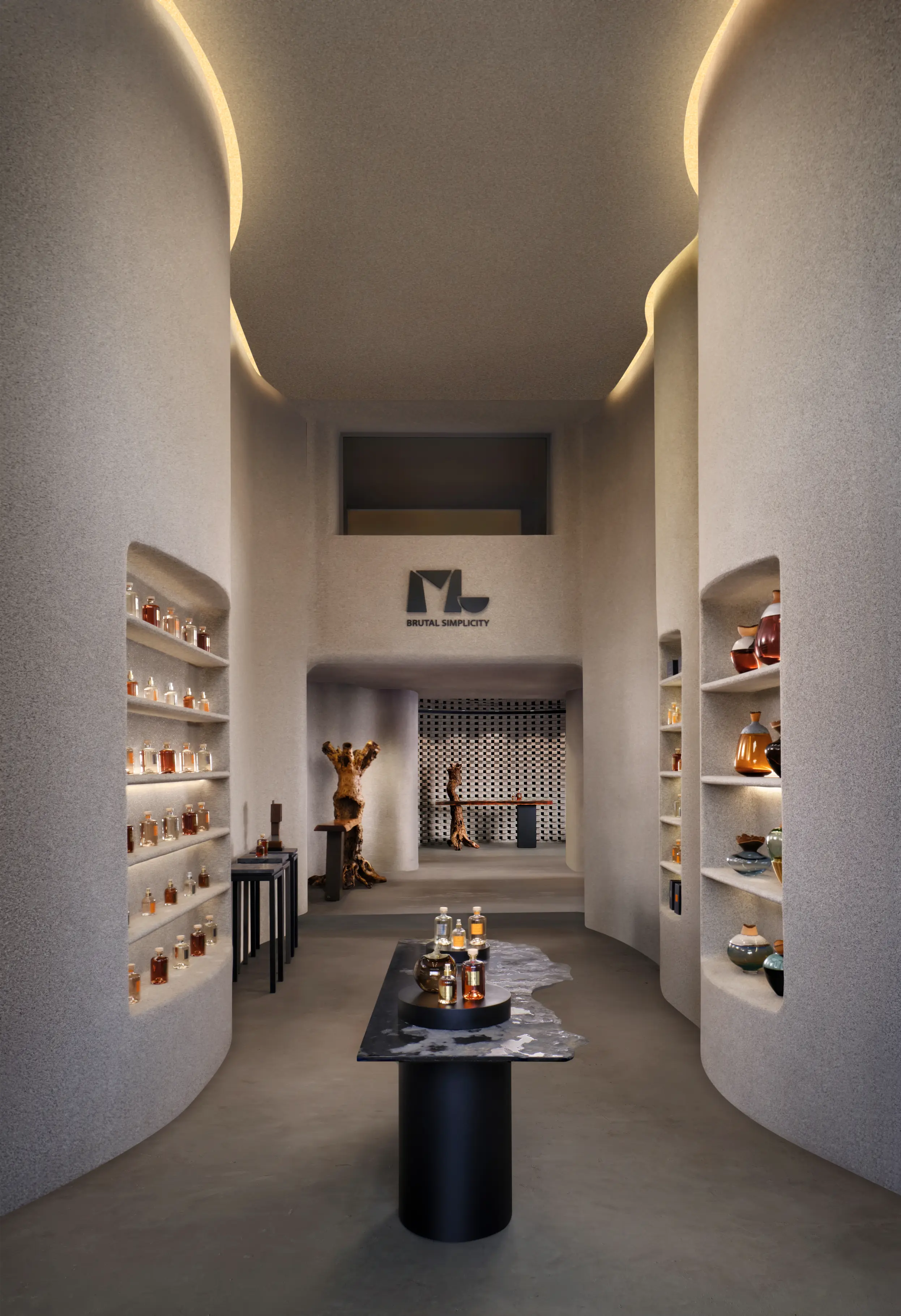 ML Atelier est une boutique dédiée à des pièces de mobilier singulières imaginées par un designer de renom. Conçu dans une approche minimaliste et brutaliste, l’espace met en tension matériaux bruts, lignes affirmées et volumes sculpturaux, tout en intégrant un mouvement organique qui adoucit et équilibre la composition architecturale. Pensé comme un lieu hybride, ML Atelier associe une sélection de senteurs et de bougies à une collection de meubles d’exception. Cette dualité entre rigueur minérale et fluidité organique crée un univers immersif où design, matière et sensorialité se rencontrent dans une esthétique contemporaine et maîtrisée.